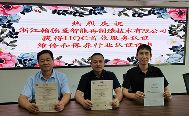 2020年9月17日,浙江翰德圣智能再制造技术有限公司(简称翰德圣)获得HQC首张维修和保养行业服务认证证书。翰德圣总经理陈书亲临北京中化联合认证有限公司(简称HQC)领取证书。