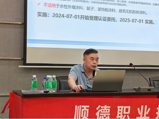 6月4日,广东省涂料与油墨行业协会联合广东产品质量监督检验研究院、北京中化联合认证有限公司,在广东涂料产业学院举办水性内墙涂料产品强制性3C认证工作培训班。广东省涂料与油墨行业协会秘书长吕水列、副秘书长陈丽霞、广东产品质量监督检验研究院涂料化工部副部长陈纪文、北京中化联合认证有限公司副总经理王鑫、注册高级检查员阮旭、高级工程师石磊、顺德职业学院轻化与材料学院院长陈燕舞,以及近五十家企业代表参加培训。